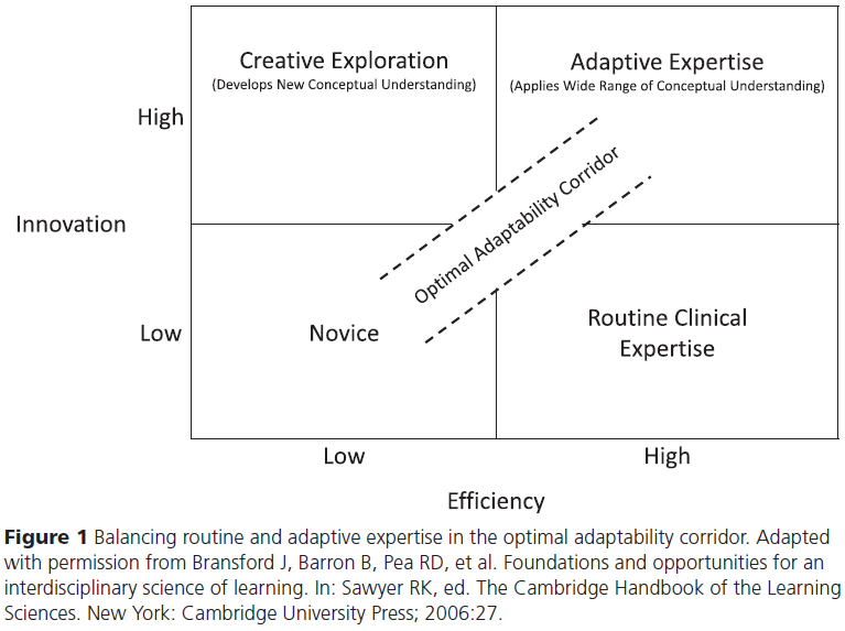 어떤 의사가 일상적 전문성과 적응적 전문성을 모두 갖추었다는 것은, 문제 해결의 효율성과 혁신성의 균형을 맞출 수 있다는 이야기이며, 이 둘이 균형을 이루는 경로를 “최적 적응성 경로optimal adaptability corridor”라고 부를 수 있다.