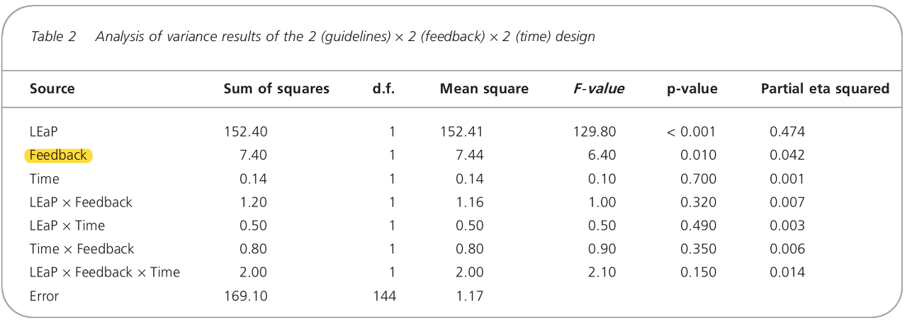 • 단, 가이드 라인과 피드백 모두의 효과가 통계적으로 유의 했음에도 불구하고, 효과 크기는 상당히 차이가 있어서, 피드백의 효과 크기는 매우 작았다.
