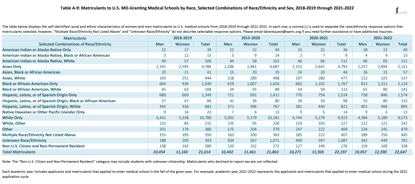 ※ 전체 미국 의과대학 입학생 구성: https://www.aamc.org/data-reports/students-residents/interactive-data/2021-facts-applicants-and-matriculants-data?fbclid=IwAR06bHpS4WpueKyj0vVkHaaXgCCAwdpiFaYPTIdlxCKUnFLqwPa45ultw0E