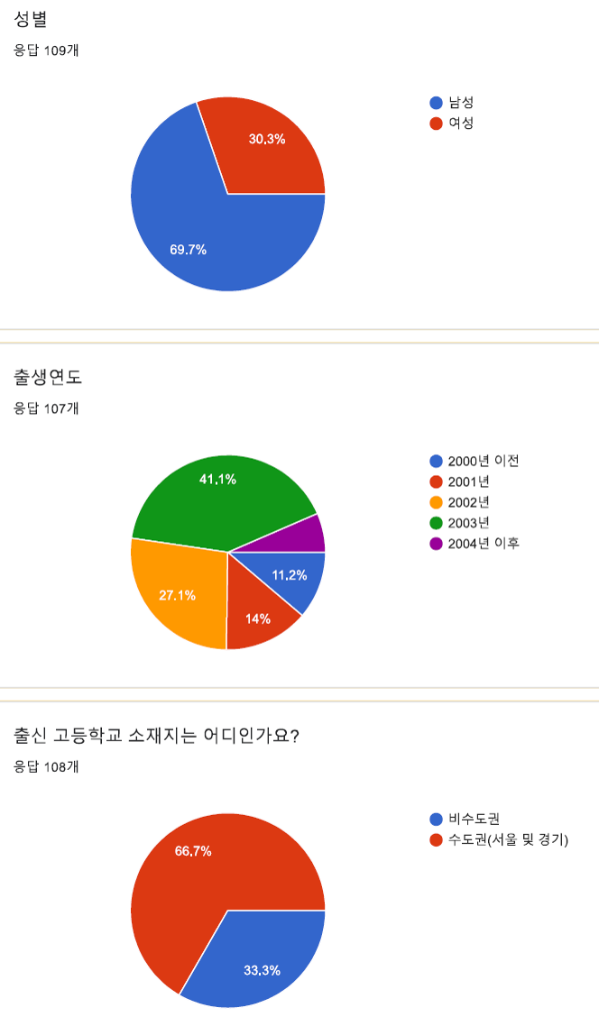 이러한 문제의식과 현실적인 필요성으로, 작년부터 두 해째 의예과 1학년 첫 수업에서 '우리들'이라는 제목의 설문을 하고 있다. 작년에 처음 이 설문을 했을 때는 비대면으로 서로 한 번도 못 만난 학생들에게 '의예과 1학년 신입생'이 어떻게 이뤄져있는지 다 같이 공유해보자는 목적이 있었다. 더불어 일부 학생에게는 자기소개도 시키며, 수업도 조금 인터랙티브하게 만들고, 학생들이 서로에 대한 유대감과 소속감을 조금이나마 키워주고자 했다. 그런데 미국의 자료를 보고, 자체적으로 설문도 두 해째 해보니, 내년에는 좀 더 문항을 다양하게 구성해볼까 하는 생각이 든다. 무슨 항목을 추가해볼까..?