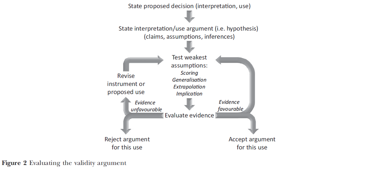 Cook, D. A., Brydges, R., Ginsburg, S., & Hatala, R. (2015). A contemporary approach to validity arguments: a practical guide to K ane's framework. Medical education, 49(6), 560-575.