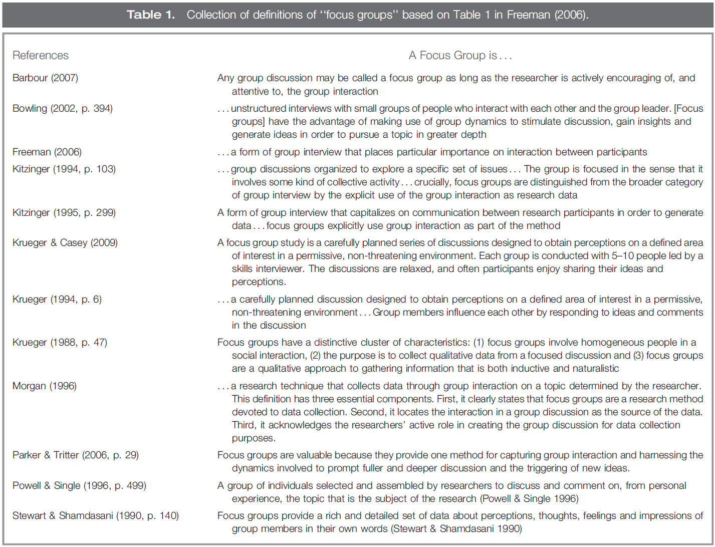 특정 이슈를 탐색하기 위한 그룹 토론. 그룹은 일종의 집단 활동을 포함한다는 점에 초점을 맞추고 있다. 결정적으로, 포커스 그룹은 그룹 상호 작용을 연구 데이터로 명시적으로 사용함으로써 더 넓은 범주의 [그룹 인터뷰]와 구별된다.