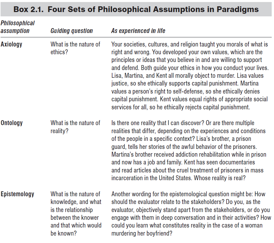 Box 2.1은 패러다임의 네 가지 철학적 가정을 보여주며, 이는 사람들이 세상을 이해하는 방식에 대한 가정들입니다. 각 가정은 평가자들이 평가를 수행할 때 그들의 관점을 형성하는 데 중요한 역할을 합니다.