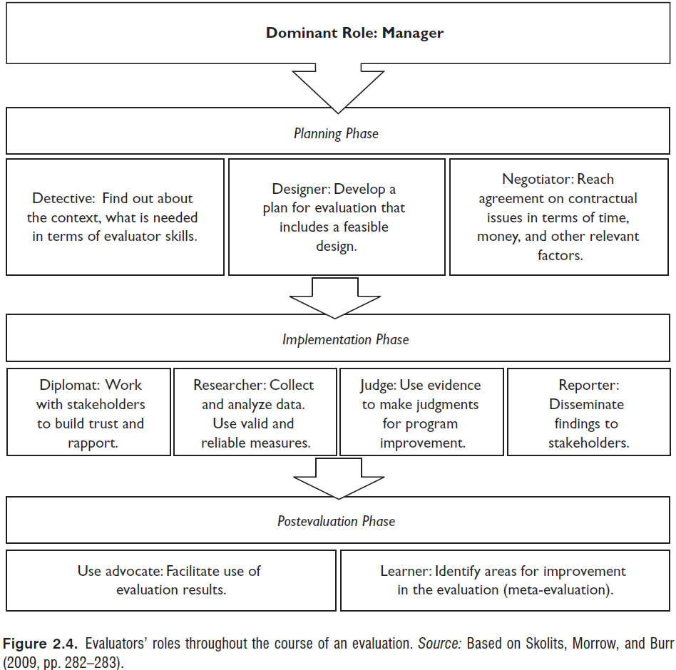 Skolits, Morrow, and Burr(2009)는 평가자의 역할을 특정 접근 방식과 연결하는 것이 평가자가 실천에서 맡는 역할의 복잡하고 역동적인 본질을 제대로 반영하지 못한다고 제안합니다. 그들은 평가 과정 동안 평가자들이 평가의 단계와 상황의 요구에 따라 많은 다른 역할을 수행한다고 주장합니다. 이들은 외부 평가에서 대부분의 평가자가 수행하는 일반적인 활동 목록을 검토하고, 평가자에게 지배적인 역할과 보조적인 역할을 설명합니다. 이러한 역할은 평가의 시작, 중간, 끝에 따라 변하지만, 전체 과정에서 지배적인 역할은 관리자의 역할입니다. 평가자는 평가를 계획하고, 실행하며, 마무리하는 복잡한 과정을 관리할 수 있어야 합니다. Skolits 등은 계획, 실행, 후평가 단계에서 더 일반적으로 발생하는 특정 역할을 식별합니다. (Figure 2.4 참조)
