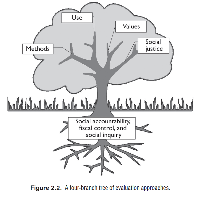 이름이 나타내듯이, 변혁적 패러다임은 사회 정의를 증진시키는 데 중점을 두고 있으며, 문화적 반응성, 인종/민족성, 인권, 페미니즘, 장애인 권리, 청각 장애, 탈식민/원주민, 퀴어 이론 및 기타 소외된 공동체를 기반으로 한 이론적 틀을 개발하는 평가자들을 포함합니다. 그림 2.2는 네 가지 평가 가지가 포함된 나무의 예를 보여줍니다. 우리는 Alkin(2013)이 나무의 가지들이 배타적exclusive이지 않다고 주장했을 때 동의하고 싶습니다. 그는 "단지 하나의 모델만이 방법론을 믿고 다른 모델은 그렇지 않다는 것이 아니다. 오히려 범주 체계는 다양한 모델 내에서의 상대적 강조를 기반으로 한다"고 썼습니다(p. 7).