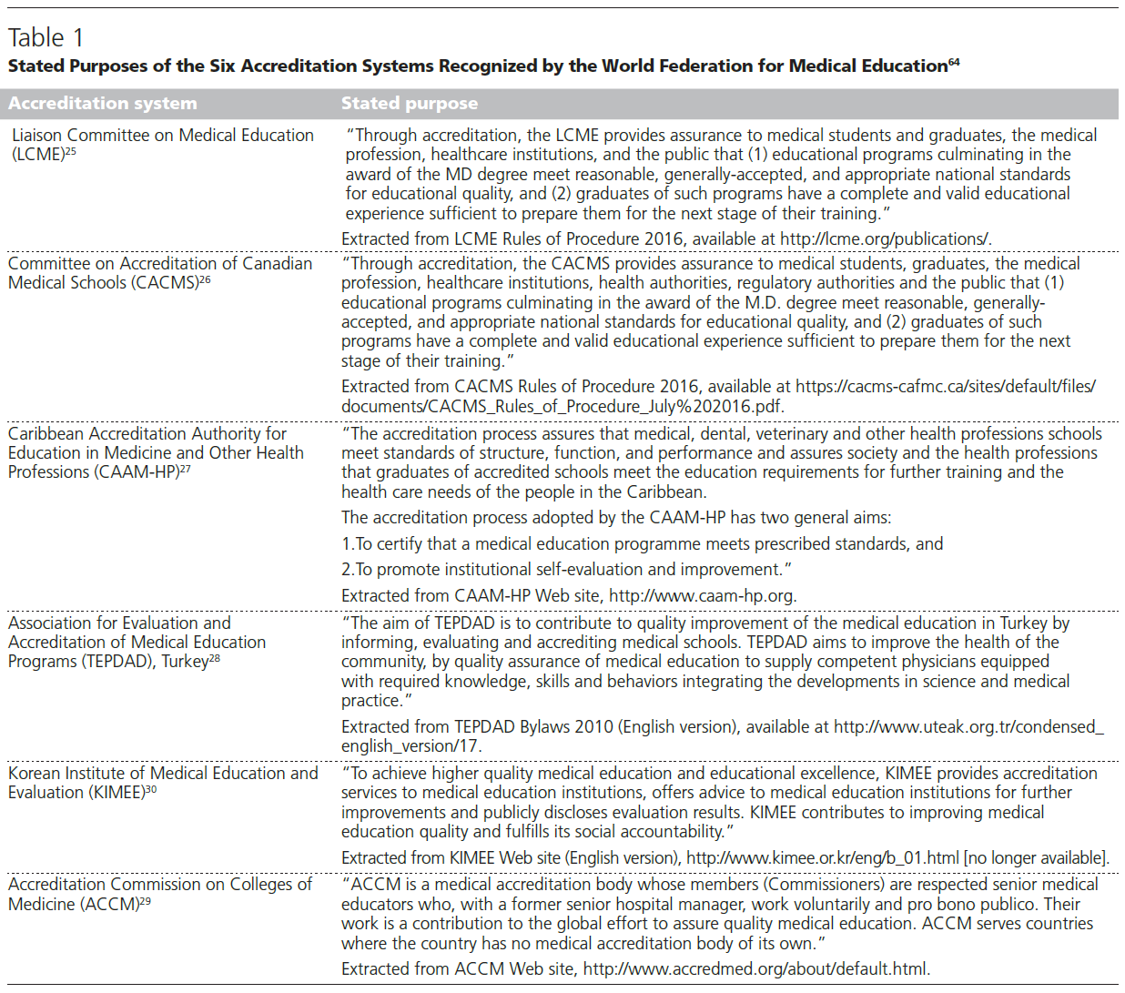 표 1: 세계의학교육연맹(WFME)에서 인정한 여섯 개의 인증 시스템의 명시된 목적