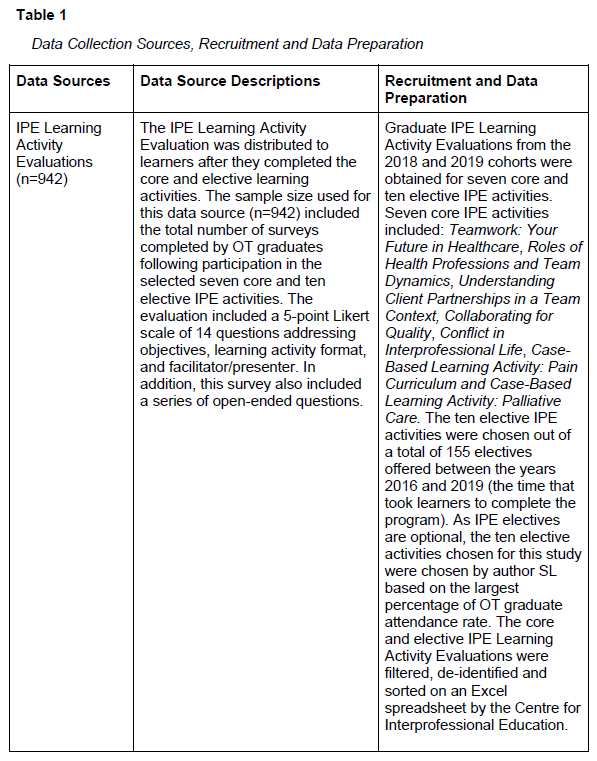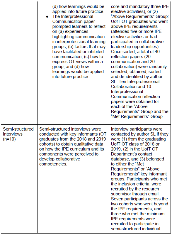 실재 평가는 방법론적으로 유연하며, 프로그램 이론을 테스트하고 정제하기 위해 모든 데이터 수집 방법을 사용할 수 있습니다. 따라서 2018년과 2019년 OT 졸업생 코호트 설문조사, 반성적 논문 및 인터뷰에서 수집한 질적 및 양적 데이터를 통해 UofT에서 제공한 IPE 커리큘럼에 대한 OT 졸업생의 관점을 종합적으로 이해하고자 했습니다.