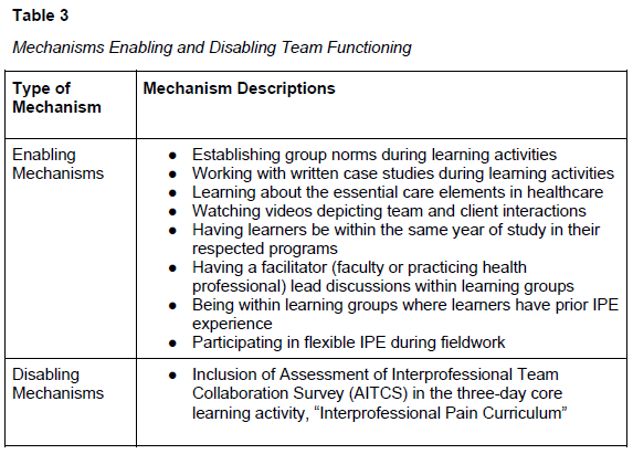 최적의 팀 기능은 의료 전문가들이 모든 팀원의 의견을 존중하고, 존중하고 윤리적인 방식으로 팀 토론을 효과적으로 촉진할 때 달성됩니다(CIHC, 2010). 정량적 및 정성적 데이터 분석을 통해 특정 메커니즘이 이 협업 역량의 개발을 촉진하고 저해했음을 발견했습니다. 정량적 분석 결과, 졸업생의 66.5%가 그룹 규범 수립이 팀 기능에 기여한다고 인식했으며, 84%는 사례 연구가 유익하다고 인식했습니다. 표 3은 팀 기능 달성을 촉진하고 저해한 메커니즘을 보여줍니다.