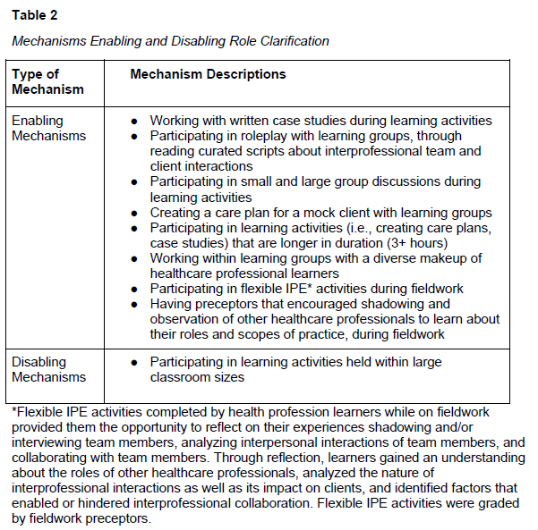 역할 명확화는 의료 전문가가 "자신의 역할, 지식 및 기술을 명확히 설명하고 의사소통하며, 다른 의료 전문가의 역할, 책임 및 역량의 다양성을 인식하고 존중하는 능력"입니다(CIHC, 2010). 정량적 및 정성적 데이터 분석을 통해 특정 메커니즘이 이 협업 역량의 개발을 촉진하고 저해했음을 발견했습니다. 핵심 및 선택 학습 활동 평가에 대한 정량적 분석 결과, 졸업생의 90%가 소그룹 토론이 역할 명확화에 기여했다고 응답했습니다. 표 2는 역할 명확화 달성을 촉진하고 저해한 메커니즘을 보여줍니다.