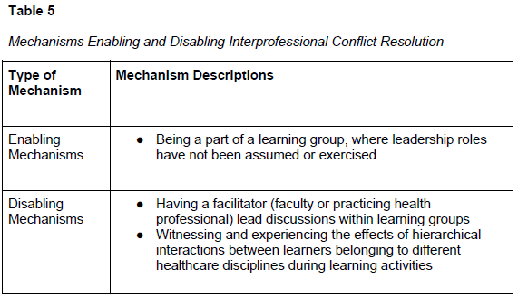 갈등을 건설적으로 해결하기 위해 의료 전문가들은 갈등을 다루는 방법을 이해하고, 적극적으로 불일치를 해결하며, 모든 사람이 다양한 의견을 표현할 수 있는 안전한 환경을 조성해야 합니다(CIHC, 2010). 정량적 및 정성적 데이터 분석을 통해 특정 메커니즘이 이 협업 역량의 개발을 촉진하고 저해했음을 발견했습니다. 정량적 분석 결과, 졸업생의 60.5%가 범위 비디오가 갈등 해결을 가르치는 효과적인 방법이라고 인식했습니다. 표 5는 다학제 간 갈등 해결 달성을 촉진하고 저해한 메커니즘을 보여줍니다.