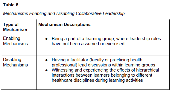 협업 리더십은 의료 전문가가 리더십 원칙을 사용하여 협력적으로 실천할 때 발생합니다(CIHC, 2010). 정량적 데이터 분석이 수행되었지만, 이 협업 역량을 반영하는 특정 메커니즘은 도출되지 않았습니다. 표 6은 협업 리더십 달성을 촉진하고 저해한 메커니즘을 보여줍니다.
