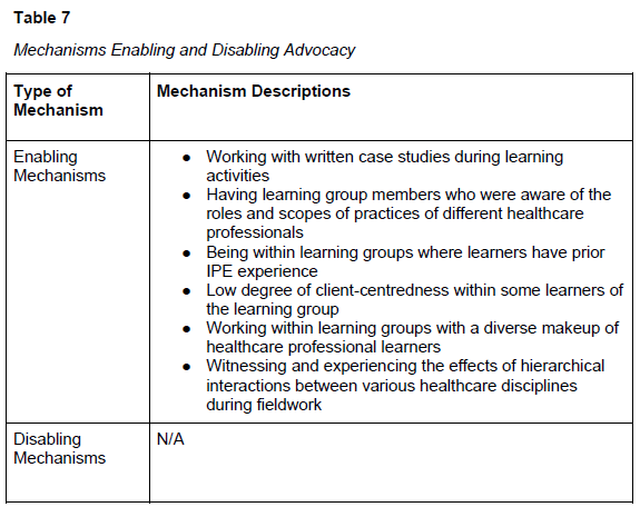 결과 1부터 5까지는 다학제 간 협업의 영역으로, 국가 다학제 간 역량 프레임워크(CIHC, 2010)에 명시된 역량과 일치합니다. 이 역량 외에도 본 연구는 OT 졸업생의 옹호 기술 개발이 커리큘럼의 중요한 결과임을 발견했습니다. 다음 섹션에서는 본 연구에서 발견된 여섯 가지 결과와 이들의 개발을 촉진하고 저해한 메커니즘을 설명합니다.
