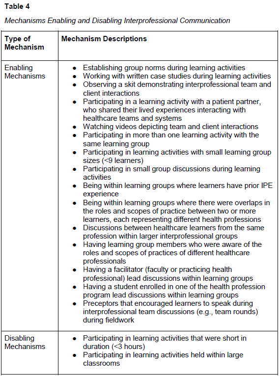 다학제 간 의사소통은 다른 의료 전문가, 환자 및 가족과 협력적이고 반응적이며 책임감 있게 의사소통하는 능력으로 정의됩니다(CIHC, 2010). 정량적 및 정성적 데이터 분석을 통해 특정 메커니즘이 이 협업 역량의 개발을 촉진하고 저해했음을 발견했습니다. 정량적 분석 결과, OT 졸업생의 63%가 대형 강의실이 학습 활동을 지원하지 않는다고 인식했습니다. 또한, 88%의 OT 졸업생이 토론을 지원하는 데 있어 조력자가 효과적이라고 인식했으며, 88.5%는 학생 리더가 효과적이라고 인식했습니다. 표 4는 다학제 간 의사소통 달성을 촉진하고 저해한 메커니즘을 보여줍니다.