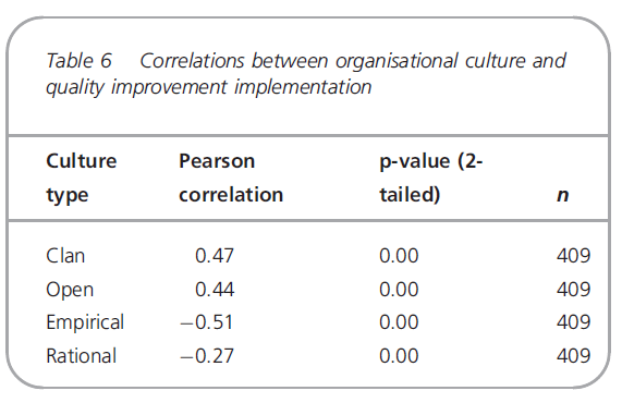 본 연구의 데이터가 이전 문헌 연구 결과를 뒷받침하는지 확인하기 위해 피어슨 상관계수를 사용하여 문화 유형과 QI 실행 정도 간의 상관관계를 테스트하여 유의성을 확인했습니다. 상관관계 분석은 IBM spss Statistics for Mac 버전 23.0(IBM Corp., Armonk, NY, USA)을 사용하여 수행되었습니다.