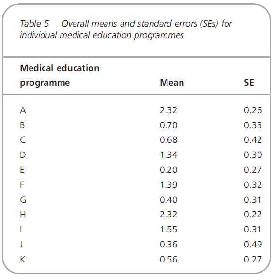 표 5. 개별 의학교육 프로그램의 전체 평균 및 표준오차(SE)