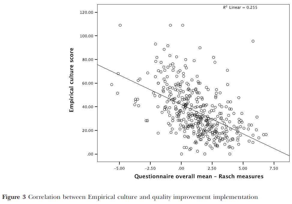 모든 프로그램의 점수는 낮았지만, 인지된 QI 실행 수준은 프로그램마다 상당한 차이가 있었습니다. 결과는 기존 문헌과 일치했습니다.6, 22, 23 QI 설문조사에서 가장 높은 점수를 받은 프로그램은 이전에 품질을 지향하는 조직 문화(이 경우 클랜 문화)를 보여주는 것으로 확인된 두 프로그램과 관련이 있었습니다.18 클랜 문화와 개방 문화는 높은 QI 실행 점수와 강력하고 긍정적인 연관성이 있었고, 경험적 문화는 인지된 QI 실행 정도와 강력하고 부정적인 연관성이 있었습니다. 이러한 결과는 대부분의 의과대학에 널리 퍼져 있는 조직 문화가 낮은 보급률, 열악한 의사소통, QI 활동의 부적절한 브랜드화 외에도 QI 활동의 실행에 대한 본질적인 저항을 야기할 수 있음을 나타냅니다.