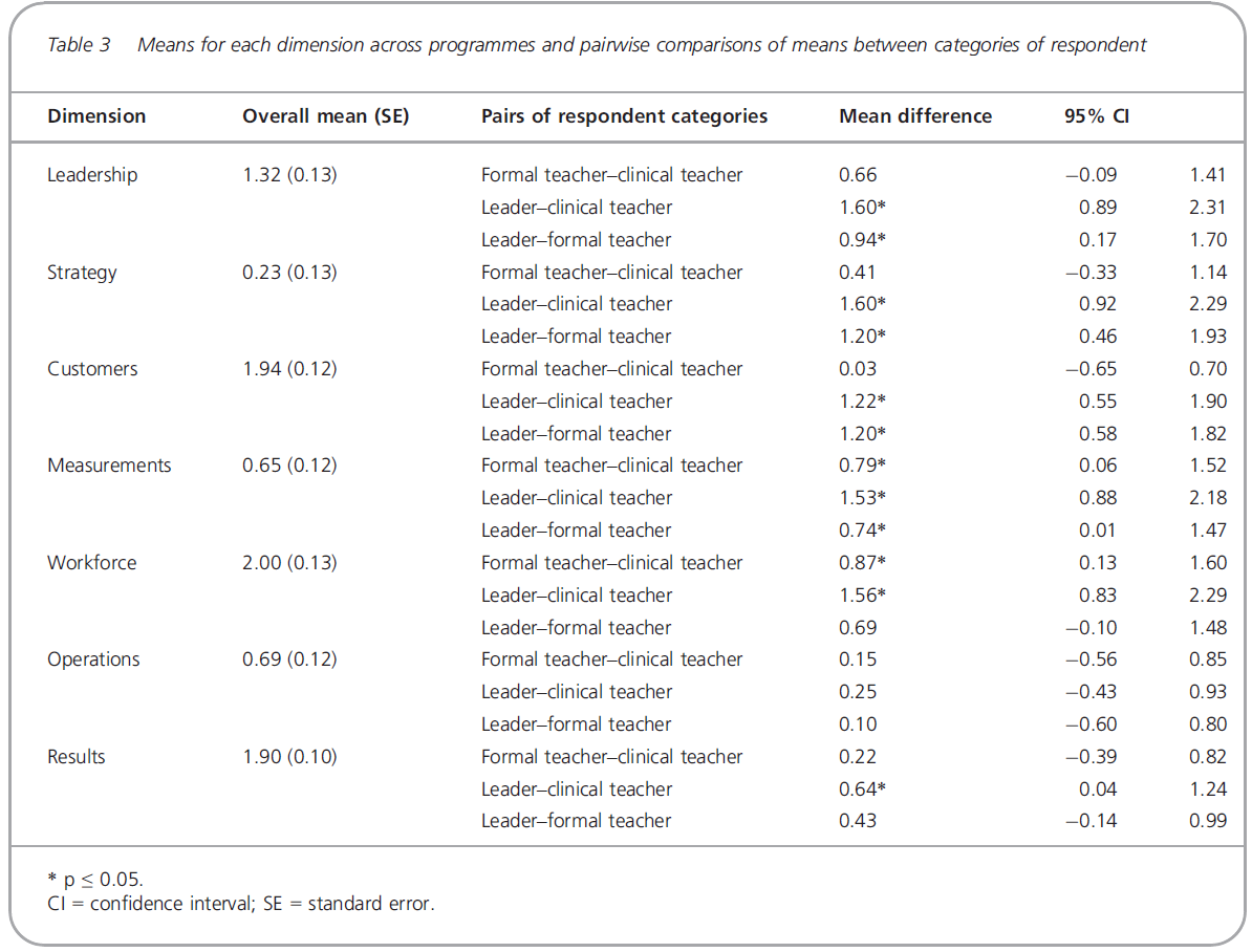 그 결과, 여러 프로그램에 걸쳐 의과대학에서 이미 시행 중인 QI 관행이 캐나다 UME에 참여한 의과대학 리더와 교사들에게 제대로 인식되지 못하고 있는 것으로 나타났습니다. 이전에 발표된 다른 분야의 연구 결과와 비교하는 것은 어렵습니다. 다른 분야의 연구는 결과를 단일 집계된 평균, 일부 선택된 영역의 평균 또는 MBNQA 프레임워크의 7개 영역별 평균으로 보고합니다. 이전 연구에서는 원시 측정값(라쉬 인 측정값으로 변환된 측정값이 아닌)을 사용하여 평균을 계산했습니다. 또한 이러한 연구에서는 중간 응답 범주를 유지했으며 이 범주의 사용 빈도에 대한 정보를 제공하지 않았습니다. 그럼에도 불구하고 병원 관리자, 직원 및 직원을 대상으로 한 연구에서는 3.3(SD 0.15)22 및 3.3(3.0-3.48)6의 종합 평균과 3.2-3.7(2개 영역 이상)6 2.94-3.77(7개 영역 이상)31 및 3.21-4.40(7개 영역 이상) 범위의 단일 도메인 측정값이 발견되었습니다. 32 정부 기관을 대상으로 한 연구에서 7개 영역 이상 평균은 4.36~4.90점이었습니다.28 마지막으로 병원 기반 간호사를 대상으로 한 연구에서 7개 영역 이상 평균은 3.2~4.0점이었습니다.23 이러한 연구에서 대부분의 평균이 3점보다 높다는 점을 고려하면 중간 응답 범주를 제거하면 점수가 더 높아졌을 것입니다.