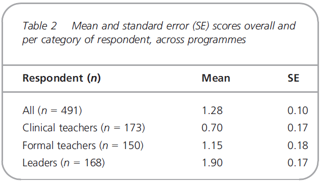 전체 설문지와 각 응답자 범주(임상 교사, 정식 교사, 리더)에 대한 라쉬 개인 측정법의 평균은 모든 프로그램에서 0.70에서 1.90까지 다양했습니다(표 2).