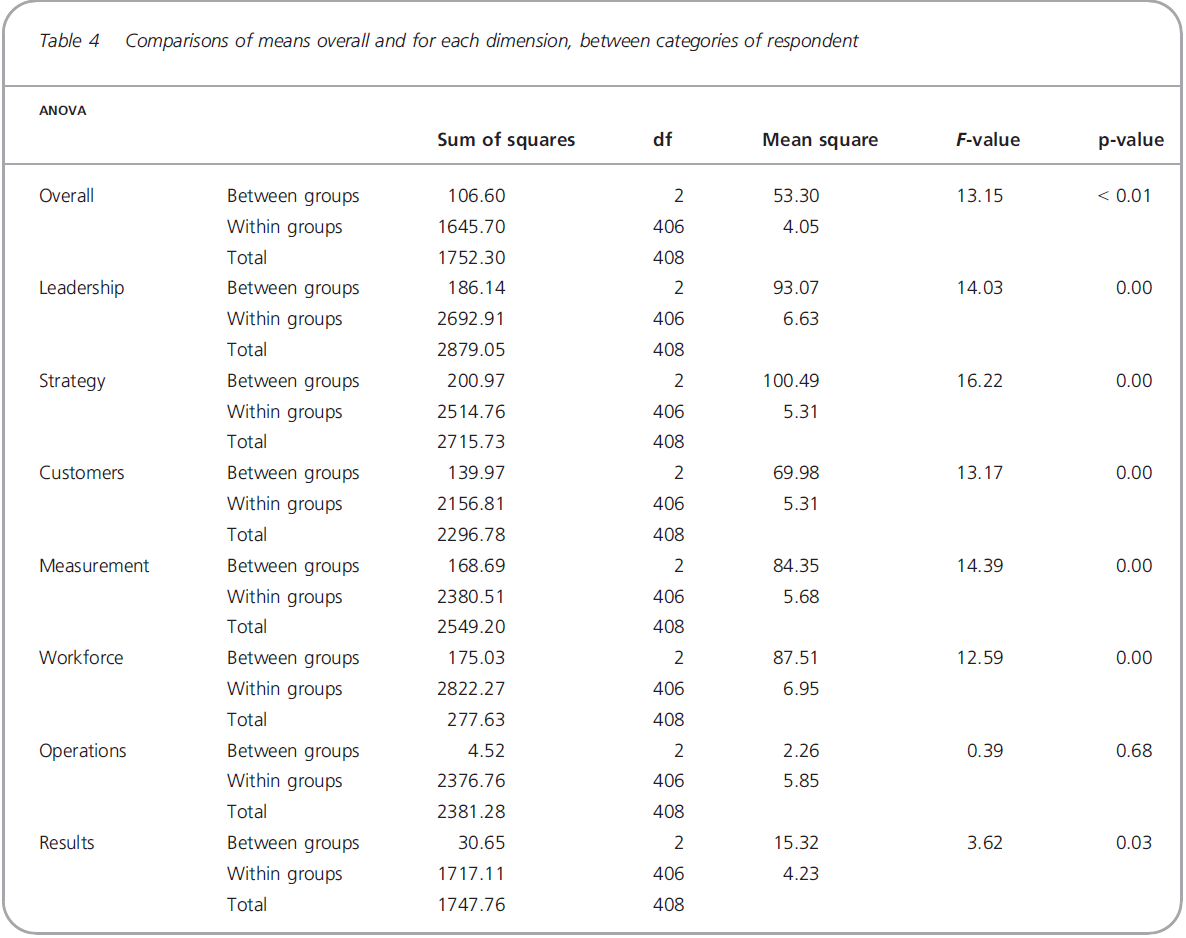 UME 프로그램에서 응답자의 역할과 참여 정도에 따라 응답자 범주 간에 QI 실행에 대한 인식이 다를 수 있으므로 응답자 범주와 각 차원의 평균 간의 관계를 평가하기 위해 일원 분산 분석(공변량 분석)을 실시했습니다. 표본의 크기가 서로 다르기 때문에 분산 분석을 실행하기 위해 Browne-Forsythe 옵션이 선택되었습니다. 평균 간의 쌍별 차이를 평가하기 위한 사후 분석은 세 그룹 간의 분산이 동일하다고 가정하지 않기 때문에 Dunnett의 C 절차를 사용하여 수행했습니다.