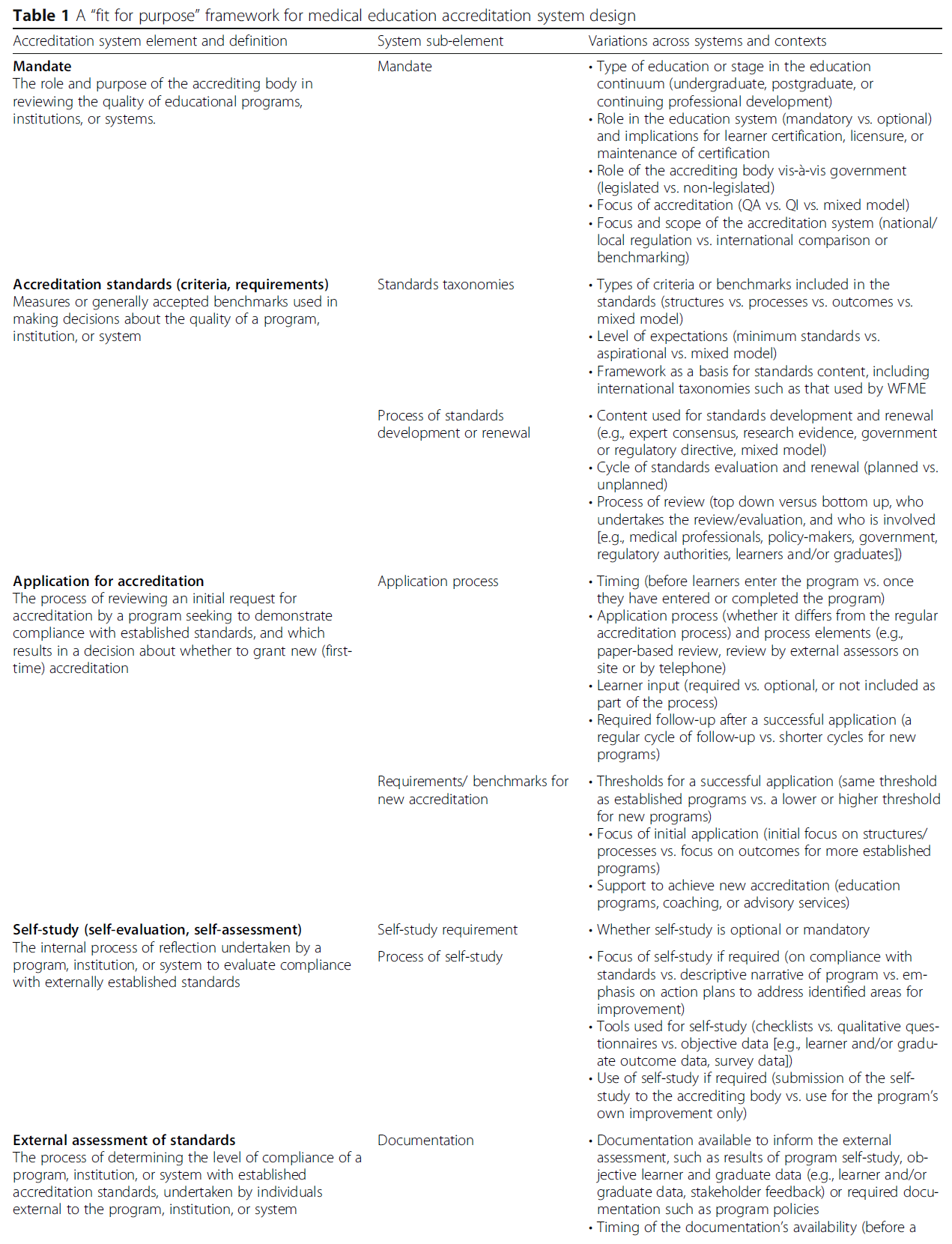 품질 보증 전략으로서 인증의 성공에 있어 핵심은 적용되는 표준과 따르는 절차입니다Central to the success of accreditation as a quality assurance strategy are the standards applied and the procedures followed. 상황에 따라 여러 유형의 표준이 사용되어 왔습니다. 매우 규범적인 표준부터 일반적인 원칙에 기반한 표준까지 다양하며, 일부는 과정보다는 교육의 결과에 초점을 맞추는 표준도 있습니다. 점점 더 많은 인증 시스템이 한 가지 유형의 표준을 사용하지 않고 구조, 과정 및 결과 기준의 균형을 추구하고 있습니다. 일부 전문가들은 이를 의학교육 인증 시스템의 설계를 위한 '목적에 맞는 프레임워크fit-for-purpose framework'라고 부릅니다.20 접근 방식은 다르지만 대부분의 인증 기관은 유사한 단계를 공유하며, 이는 주기적으로 반복되어야 합니다: