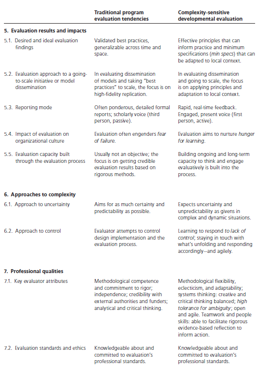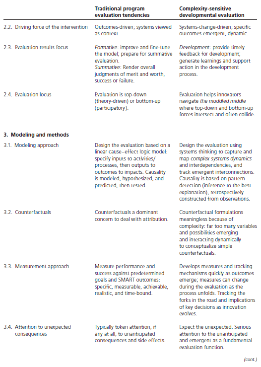 전통적인 평가 접근 방식은 이러한 격변에 적합하지 않다. 전통적인 평가는 혼돈에 질서를 부여하고 예측하며 통제하려 한다. 개발적 평가는 복잡성에 직면하여 사회 혁신의 세계가 펼쳐지는 방식으로 이러한 격변을 수용한다. 개발적 평가는 무질서하고 불확실한 세계에 질서와 확실성을 부과하려고 하기보다는 복잡한 비선형 역학의 현실에 적응한다.