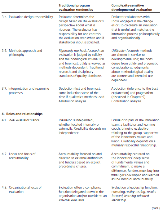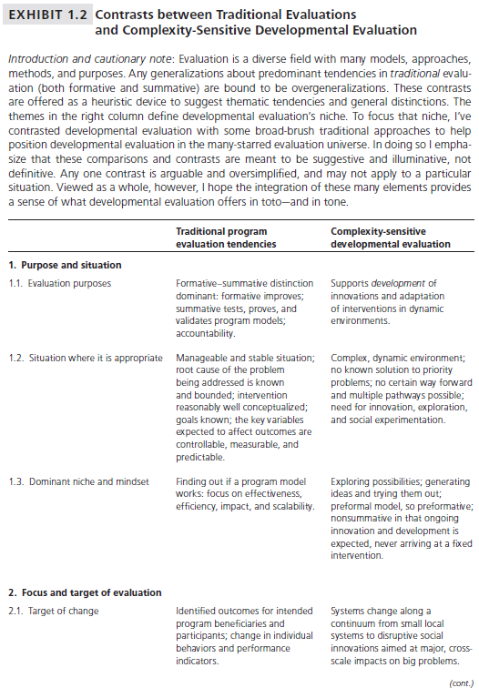 Exhibit 1.2는 개발적 평가의 틈새에 대한 개요를 제공한다. 나는 개발적 평가를 전통적인 접근 방식과 대조하여, 평가의 많은 별이 있는 우주에서 개발적 평가를 위치시키는 데 도움을 주기 위해 비교와 대조를 시도했다. 이러한 비교와 대조는 제안적이고 조명적이어야 하며, 결론적이지 않다. 하나의 대조는 논쟁의 여지가 있을 수 있으며, 과장되거나 단순화될 수 있다. 그러나 전체적으로 보면 이러한 많은 요소의 통합이 개발적 평가가 제공하는 것에 대한 감각을 제공하기를 바란다.