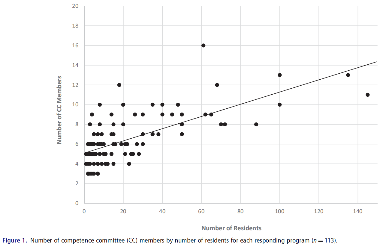 위원회 구성원 수는 3명에서 20명까지 다양했으며, 응답자의 대부분(55%)은 위원회가 4~6명으로 구성되어 있다고 답했습니다. 스피어만 순위 상관 분석 결과, 프로그램 내 레지던트 수와 CC 구성원 수 사이에 유의미하고 중간 정도의 양의 상관관계가 있는 것으로 나타났습니다 [rs(103) = 0.6, p < .01] (그림 1).