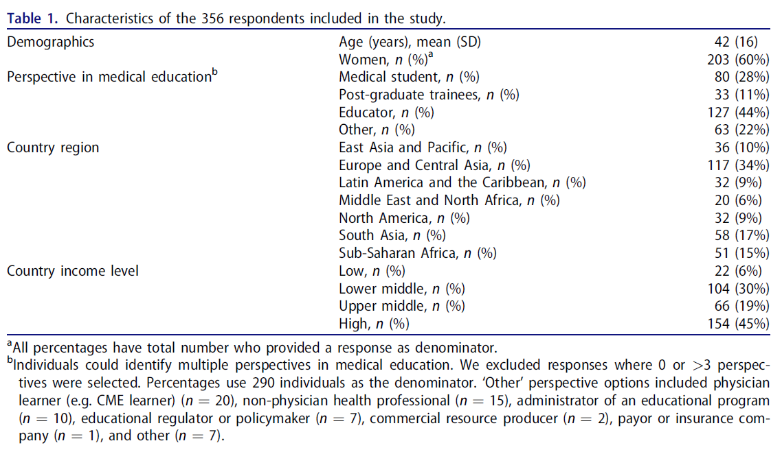 총 382명이 설문에 응답했습니다. 이 중 26명의 미국 응답자를 제외하고 356명의 응답자가 분석에 포함되었습니다. 평균 연령은 42세(SD 16세)였으며, 대다수는 여성(n = 203/339, 60%)이었습니다. 가장 많이 대표된 관점은 교육자(n = 127/290, 44%), 의과대학생(n = 80/290, 28%), 그리고 대학원생(n = 33/290, 11%)이었습니다. 응답자들은 88개국에서 왔으며, 국가 소득 수준과 지역에 고르게 분포되어 있었습니다. 어떤 월드뱅크 카테고리에서도 응답자의 과반수를 차지하지 않았습니다 (표 1).