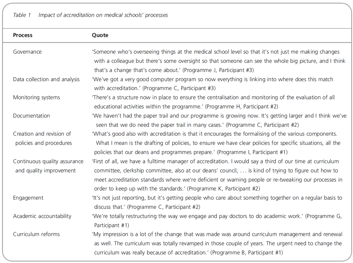 출처: Blouin, D., Tekian, A., Kamin, C., & Harris, I. B. (2018). The impact of accreditation on medical schools’ processes. Medical education, 52(2), 182-191.