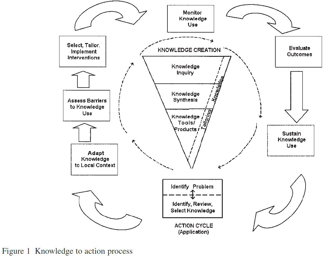 이 문제는 1960년대 Donabedian의 초기 품질 보증 작업 이후 계속되고 있으며, 연구 결과가 제때 실무에 반영되지 않는다는 점에 대한 인식이 높아지고 있으며, 또한 현재의 증거 기반, 비용 효율적이며 책임 있는 의료에 대한 강조와 맞물려 지식에서 행동으로의 격차(Knowledge-to-Action, KTA)를 최소화minimize what might be described as the knowledge-to-action (KTA) gap하기 위한 방법을 찾는 관심이 증가하고 있습니다. 우리는 ‘행동(action)’이라는 용어를 사용하기로 선택했는데, 이는 실무보다 더 일반적이고, 지식을 사용하는 주체로서 실무자뿐만 아니라 정책 결정자, 환자, 대중을 포괄하기 때문입니다. 특히 우리는 이러한 용어들이 특정 환경에서 유행어로 자리 잡으면서 그 의미가 남용되고 있으며, KTA 과정에 포함된 개념과 구성 요소에 대한 명확성이 부족하다는 점the misuse of the terms that in some settings has led to their status as buzz words and the lack of clarity about the concepts and components에 우려하고 있습니다.
