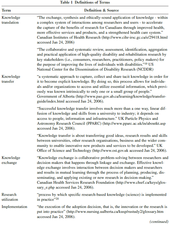 여러 용어 중에서 지식 번역(KT, Knowledge translation)은 캐나다에서 점점 더 주목받고 있는 용어입니다.16–19 캐나다 보건 연구소(CIHR)는 2000년에 이 용어를 정의했습니다. CIHR의 정의에 따르면, 지식 번역의 주요 목적은 [연구와 지식 합성에서 알려진 것]과 [주요 이해관계자에 의해 이 지식을 실행하는 것] 사이의 격차를 해결함으로써 건강 결과를 개선하고 의료 시스템의 효율성을 높이는 것 the primary purpose of KT is to address the gap between what is known from research and knowledge synthesis and implementation of this knowledge by key stakeholders with the intention of improving health outcomes and efficiencies of the health care system입니다. 여기서 중요한 것은 지식의 의미에 암시된 내용으로, 주로 과학적 연구가 그 핵심이며, CIHR은 연구자와 사용자의 상호작용이 연구자들에 의해 생산되는 연구 또는 과학으로 한정된다는 점을 명확히 하고 있습니다. 이 정의의 또 다른 중요한 요소는 KT 과정이 이해관계자 간의 상호작용으로 구성된 복잡한 사회적 시스템 내에서 발생한다는 것을 인정하는 것입니다. CIHR의 정의는 상호작용의 의미에 대해 명시적으로 설명하지는 않았지만, 상호작용은 단순한 의사소통에서 지식 교환에 이르기까지 다양할 수 있습니다. 반면, NCDDR(미국 장애 연구 보급국)의 정의는 상호작용이 협력적이고 양방향임을 명확히 하고 있습니다.