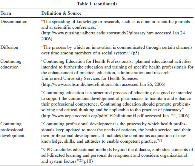 KTA 담론을 형성하는 더 중요한 용어들에 대한 논의에서 전파(dissemination)와 확산(diffusion)을 언급하지 않고는 완전하지 않습니다. 이 두 용어는 지식 개발(즉, 지식의 창조나 지식의 질) 또는 지식의 실제 수용이나 실행에 중점을 두지 않는다by their general lack of emphasis on the development of the knowledge (i.e., the creation of the knowledge or the quality of the knowledge) or the actual uptake or implementation of the knowledge는 점에서 앞서 언급한 용어들과 차별화됩니다. 이들은 종종 이해관계자들에게 지식 제품을 널리 알리거나 지식 제품을 널리 알리기 위한 구체적인 전략을 지칭하는 데 사용됩니다. Rogers의 확산 정의는 이 현상의 사회적 성격을 인정하지만, 이 복잡성은 이 용어를 사용하는 사람들에 의해 종종 간과됩니다. 또한 일부는 전파를 KTA 정의와 유사하게 사용하지만, 이는 의료 분야에서 일반적으로 사용되는 전파의 정의와는 다릅니다. 예를 들어, 1993년에 Hutchinson과 Huberman은 전파를 “지식이 개념적으로나 도구적으로 ‘사용’될 것이라는 기대와 함께 환경 간에 지식을 전이하는 것”으로 정의했습니다.27 더 최근에는 Kerner와 동료들이 연구를 실무로 전환하는 복잡한 과정을 전파라는 용어로 사용했습니다.28