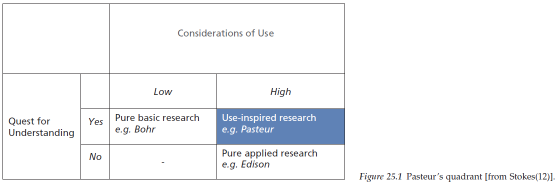 또한 주목할 만한 점은 일부 이론 구축 개념이 여전히 실증주의 전통에 뿌리를 두고 있지만, 이론은 '성공했다/실패했다'는 단일한 환원주의적 틀로 세계를 설명할 수 없다는 사실을 인식할 때 가장 잘 활용된다는 것이다. 또한, 앞서 언급했듯이, 연구가 이론에 기반한다고 해서 그것이 실천과 무관하다는 의미는 아니다. 오히려, Stokes가 설득력 있게 설명한 바와 같이, 이론 기반의 기초 과학 연구와 실용적 연구 노력을 동일한 연속선의 양 끝에 있는 것으로 해석해서는 안 된다. Stokes는 이 두 연구 목표가 독립적인 축으로 간주되어야 하며, 가장 훌륭한 연구는 그가 '파스퇴르의 사분면(Pasteur's quadrant)'이라고 부른 영역에 위치한다고 주장했다. 이는 루이 파스퇴르가 박테리아학에 대한 근본적인 지식을 크게 발전시키는 동시에, 와인과 비단 산업, 그리고 의학에 실질적인 영향을 미쳤다는 점에서 유래한 것이다. (그림 25.1 참고)