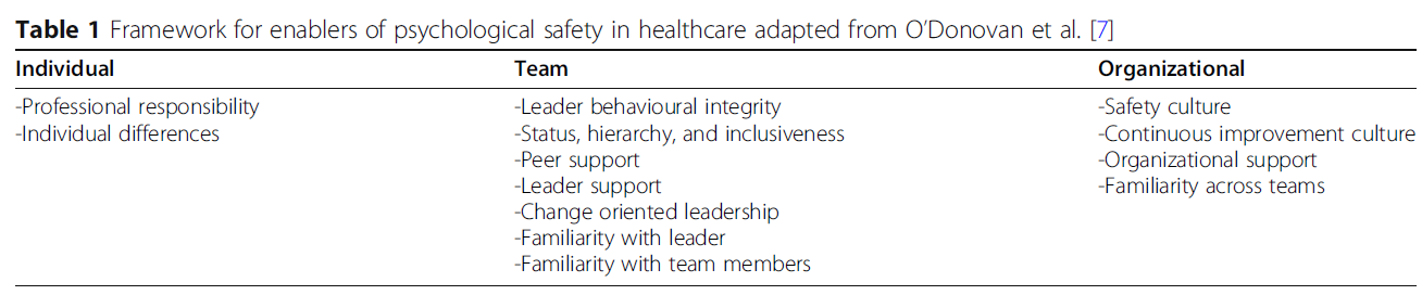 표 1 의료 분야에서 심리적 안전성 촉진 요인에 대한 프레임워크, O'Donovan 외 [7]의 연구에서 수정됨