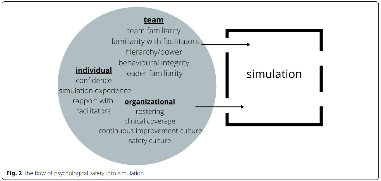 출처: Purdy, E., Borchert, L., El-Bitar, A., Isaacson, W., Bills, L., & Brazil, V. (2022). Taking simulation out of its “safe container”—exploring the bidirectional impacts of psychological safety and simulation in an emergency department. Advances in Simulation, 7(1), 5.