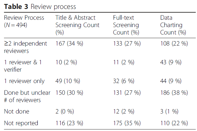- 두 명의 리뷰어가 독립적으로 제목/초록을 스크리닝하는 것(64%에서 누락됨),