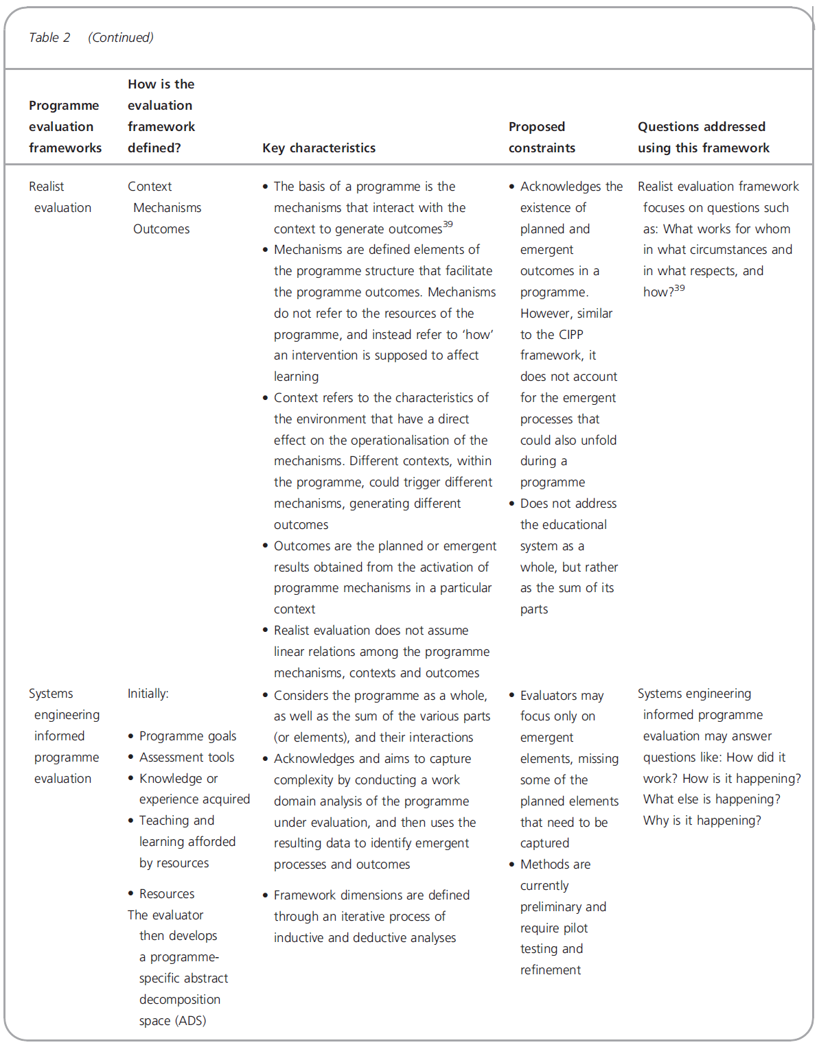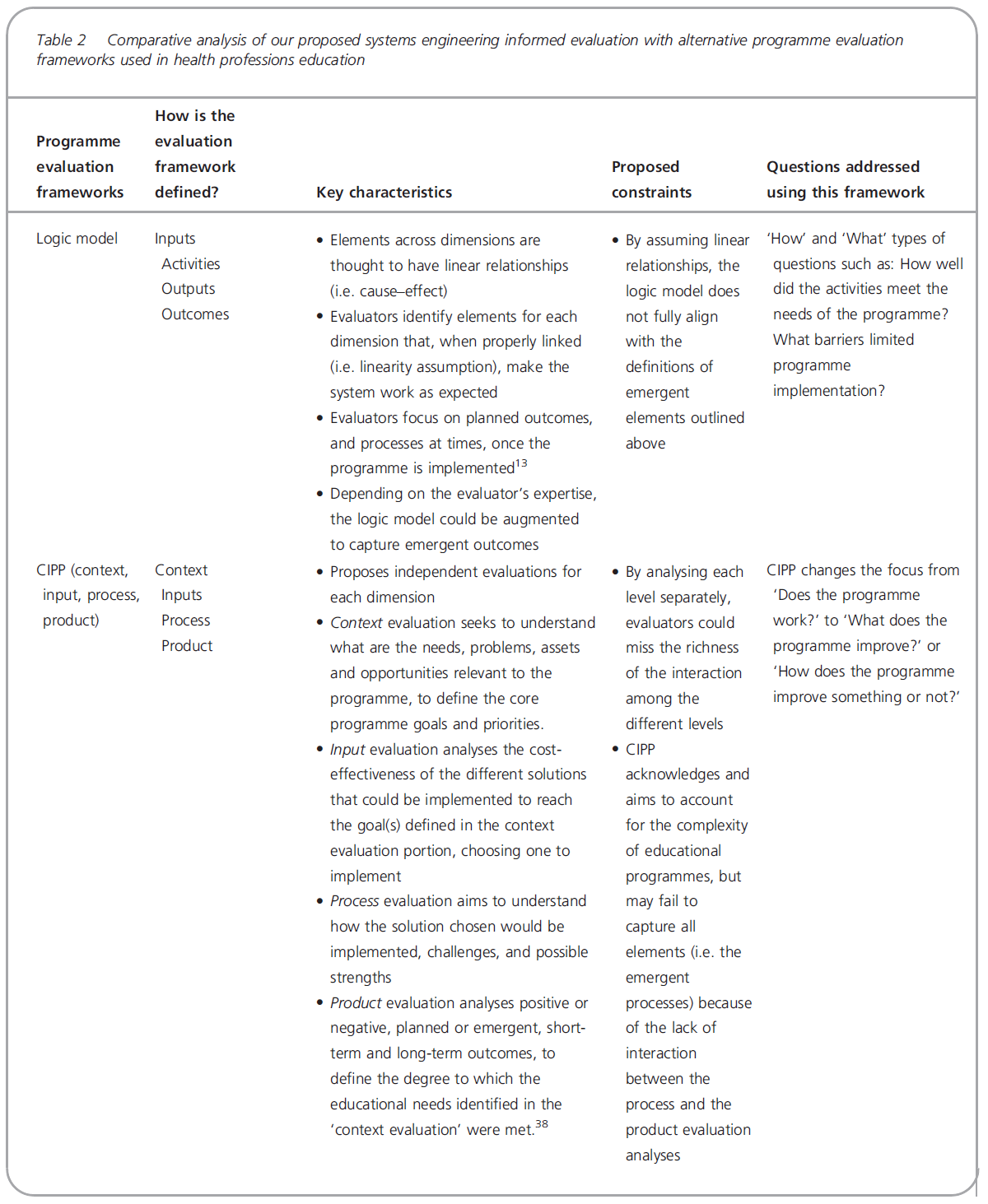 Using systems engineering principles and tools is novel for programme evaluation, yet we recognise concepts like complexity and emergence are included in other programme evaluation frameworks. In this section, we contrast our framework with specific evaluation alternatives common in HPE (see Table 2). We chose not to include programme evaluation frameworks that focus only on outcomes, because effective HPE evaluations must shift to frameworks aimed at understanding all programme elements, not simply outcomes.