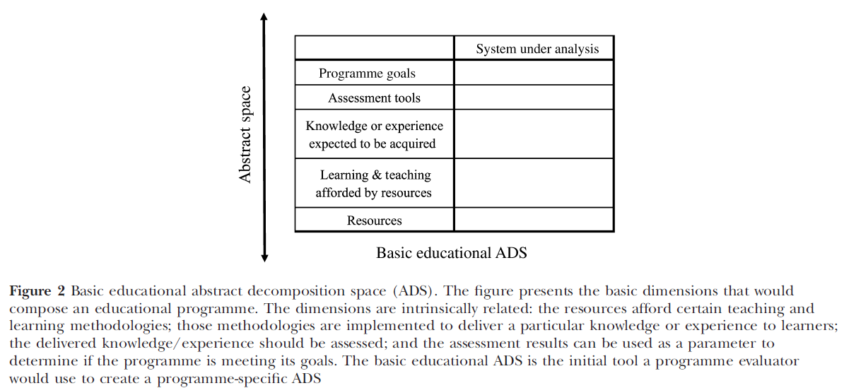 Our systems engineering framework begins with conducting a work domain analysis to produce a programme-specific ADS. We propose that a robust programme-specific ADS will allow evaluators to study how the programme’s specific characteristics shape the behaviours of the stakeholders, and whether programme resources support achieving programme goals. We understand that our systems engineering thinking will not translate seamlessly into education; therefore, we anticipate a programme-specific ADS of an educational programme will capture most, but not all, relevant elements, processes and outcomes. As Kenneth Burke stated: ‘Every way of seeing is also a way of not seeing’.