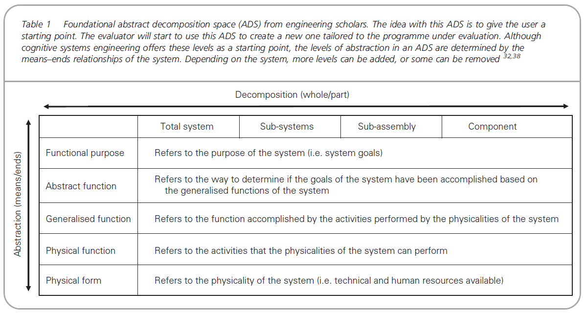 우리의 시스템 엔지니어링 프레임워크는 **작업 도메인 분석(work domain analysis, WDA)**을 수행하여 **프로그램별 추상적 분해 공간(programme-specific ADS)**을 도출하는 것에서 시작된다. 우리가 제안하는 강력한 프로그램별 ADS는 평가자들이 프로그램의 특정 특성이 이해관계자의 행동을 어떻게 형성하는지, 그리고 프로그램의 자원이 프로그램 목표 달성을 지원하는지 여부를 연구할 수 있도록 한다.