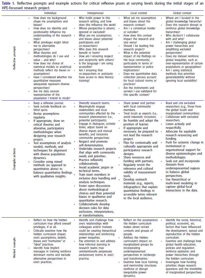 "건강전문직 교육 연구는 글로벌 권력 불균형을 강화하며, 서구적 관점을 우선시하고 글로벌 사우스 및 소외된 공동체의 지식을 배제하는 경우가 많다." ("Health Professions Education (HPE) research often reinforces global power imbalances, privileging Western perspectives while excluding knowledge from the Global south and marginalized communities.")