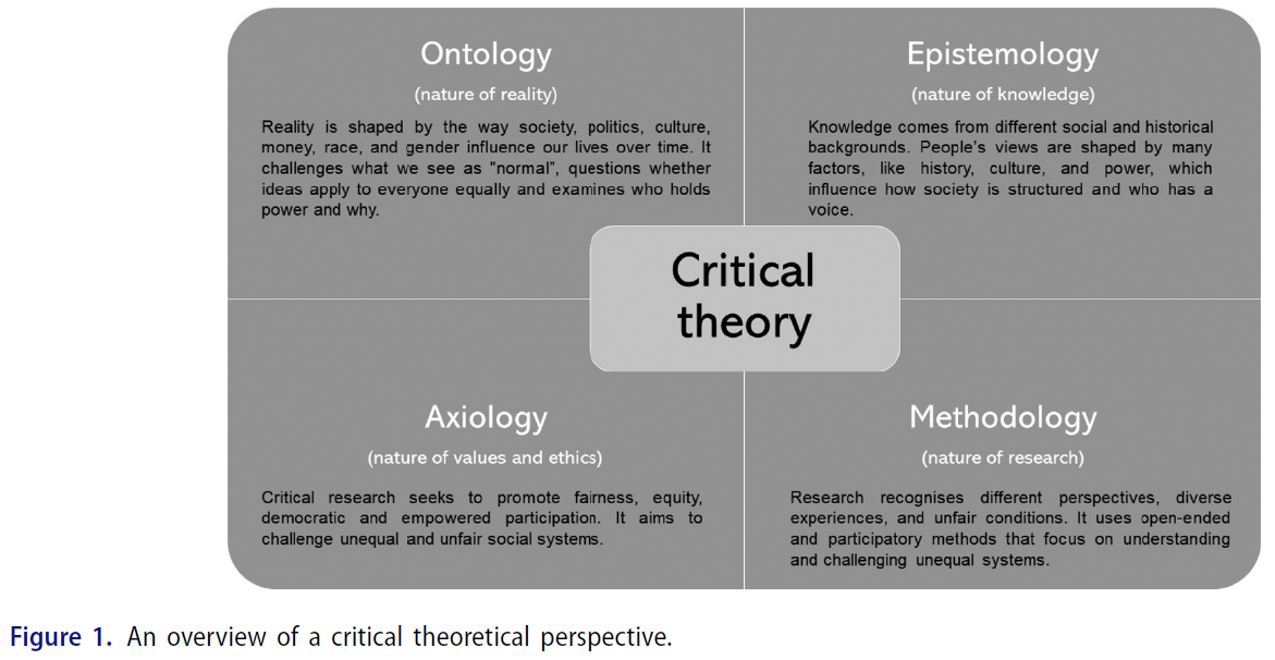 즉, 비판적 이론은 현실을 바라보고 이해하는 방법(존재론), 지식이 어떻게 형성되는가(인식론), 어떤 지식이 가치 있고 윤리적인가(가치론), 그리고 어떻게 연구를 수행할 것인가(방법론) 모두에서 우리가 흔히 간과하는 권력과 불평등의 문제를 드러내고 이를 해결하도록 도와줍니다.
