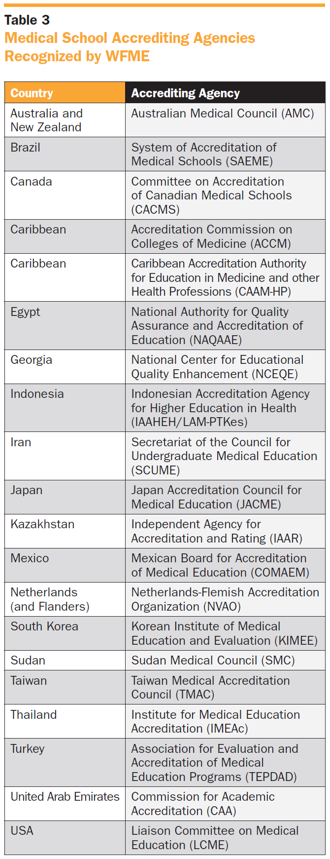 현재까지 다양한 국가의 20개 인증기관이 WFME의 공인을 획득하였다. 해당 기관들은 *표 3(Table 3)*에 수록되어 있다.³³