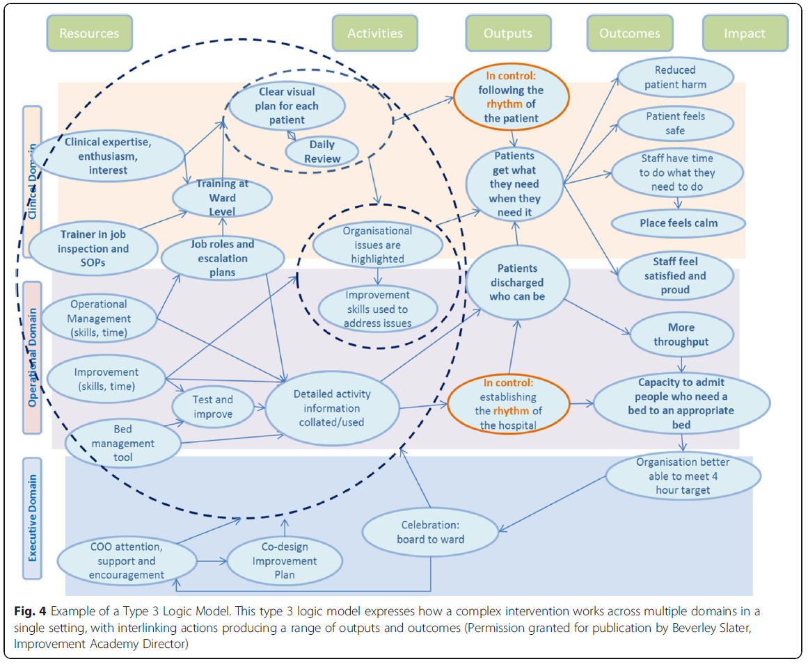 이미 복잡하고 적응적(complex and adaptive) 성격을 지닌 것으로 알려진 중재의 경우, 연구자들은 **4형 로직 모델의 개요(outline)**를 사용하여, 프레임워크 매트릭스에 포함된 데이터에 근거해 내용을 채워갈 수 있다.