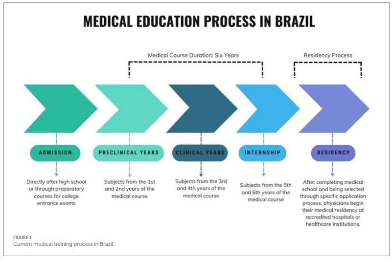 그럼에도 불구하고, 의과대학의 양적 확대와 지역 분포의 개선에도 불구하고, 현재의 의학교육 과정(Figure 1 참조)은 여러 비판과 도전 과제에 직면해 있다. 이에 본 연구는, 브라질 남동부, 북동부, 중서부 지역에서 의과대학의 기획, 실행, 운영에 직접 관여한 소수의 의학교육 전문가들의 경험을 바탕으로 구성되었으며, 역사적 맥락, 극복한 도전들, 현 정부 정책의 주요 성과와 한계에 대한 자세한 분석을 제공한다. 또한, 현재 의학교육의 구조가 향후에 미칠 잠재적 영향에 대해서도 비판적 성찰을 제시한다.