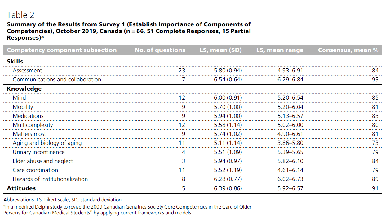 또 하나의 제한점은, 비(非)노인의학 전문가들(e.g., 학부 의학교육 리더, 학장, 부학장, 기타 전문과 의사) 및 **수련생(trainees)**의 참여가 제한적이었다는 점이다. **캐나다 통계청(Statistics Canada)**에 따르면, **2022년 7월 1일 기준으로 65세 이상 성인은 전체 인구의 약 18.8%**를 차지하고 있으며³⁷, 대부분의 임상의는 임상에서 노인을 마주치게 된다. 또한, 많은 진료과의 교육과정이 노화와 관련된 질환을 중심으로 구성되어 있기 때문에, 이러한 진료과 전문가들의 관점은 본 역량을 정교화하고 표준화하는 데 있어 매우 가치 있는 자산이 될 수 있다.