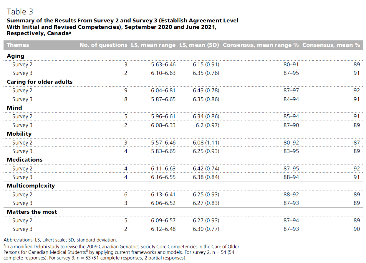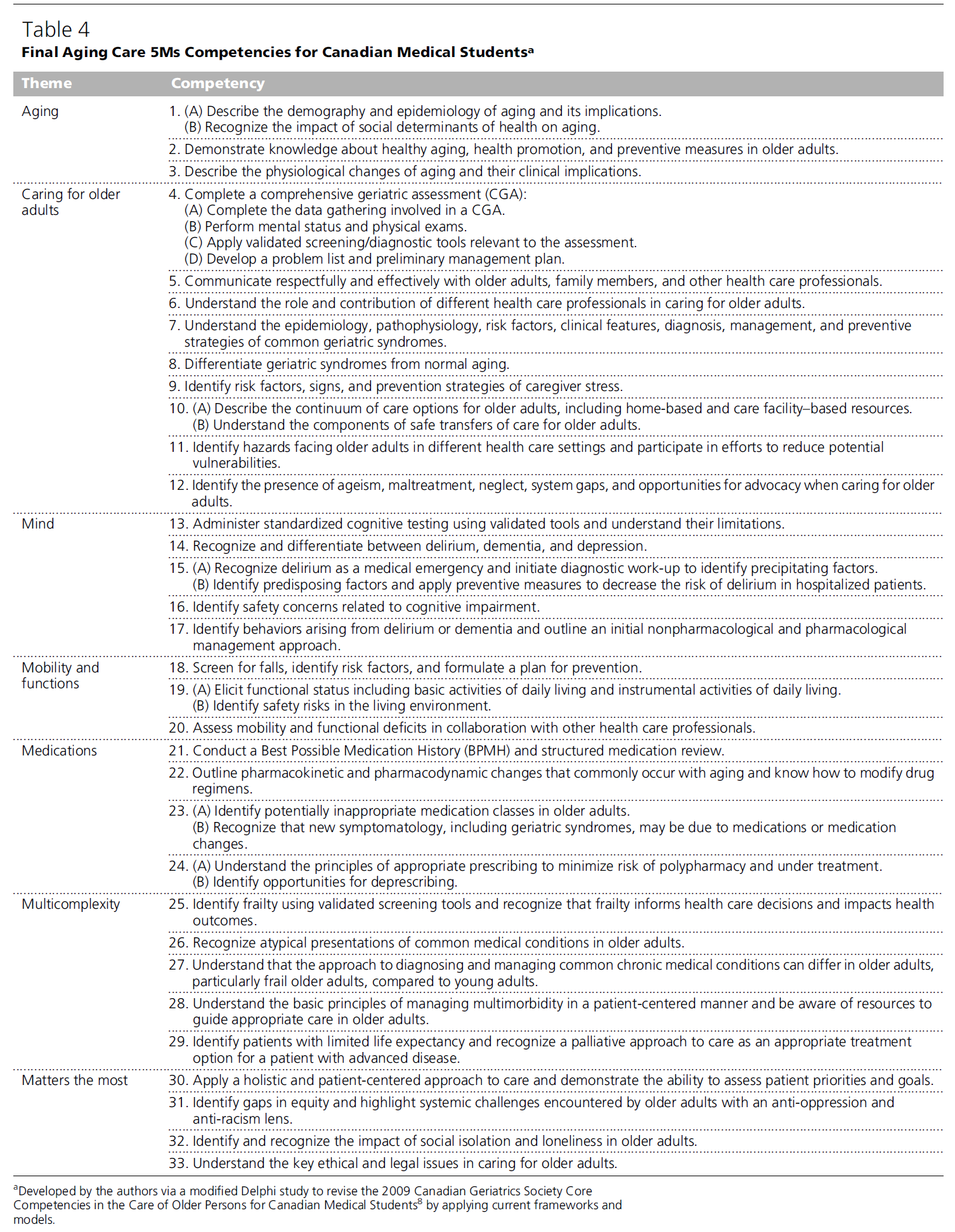 캐나다 의과대학생을 위한 33개의 Aging Care 5Ms 핵심 역량은 **엄격한 수정형 델파이 방법론(modified Delphi methodology)**을 통해 개발되었다. 이 역량의 실행을 돕기 위해 **관련 주제 및 학습 자원, 그리고 이에 상응하는 MCC 학습목표(MCC learning objectives)**를 포함한 **보조 부록(companion appendix)**도 함께 개발되었다. 대부분의 초기 역량 항목(2차 설문)과 모든 수정된 역량 항목(3차 설문)은 높은 합의 수준과 긍정적인 검증 의견을 받았다. 반면, 델파이 과정에서 제외된 역량 요소들(예: 노화 이론)은 의과대학생 교육 수준에서는 우선순위가 낮다고 판단되었다.