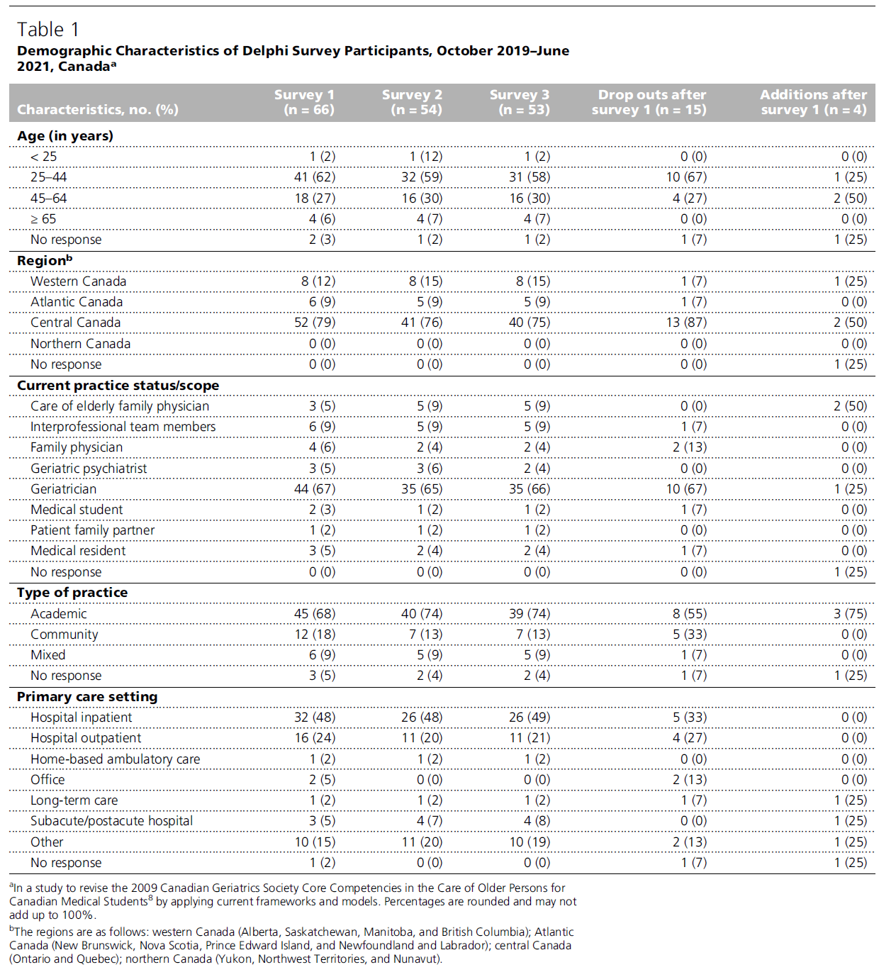 참여자의 지역 분포는 캐나다 내 노인 인구와 보건의료 자원의 분포를 반영하고 있었다. 많은 설문 참여자는 중부 캐나다 출신으로, 이 지역은 노인 인구 밀도³²⁻³³와 보건의료 자원³⁴이 높은 지역이다. 반면, 서부 및 대서양 연안 지역은 노인의학 전문의 수가 적고, 진료 부담이 큰 상황이기 때문에 높은 임상 수요로 인해 설문 참여가 어려웠을 가능성이 있다. 일부 델파이 참여자는 북부 캐나다의 2·3차 진료의뢰 병원 소속이었으며, 이 지역은 의과대학이 없고 지리적으로 고립된 인구 희박 지역이다.
