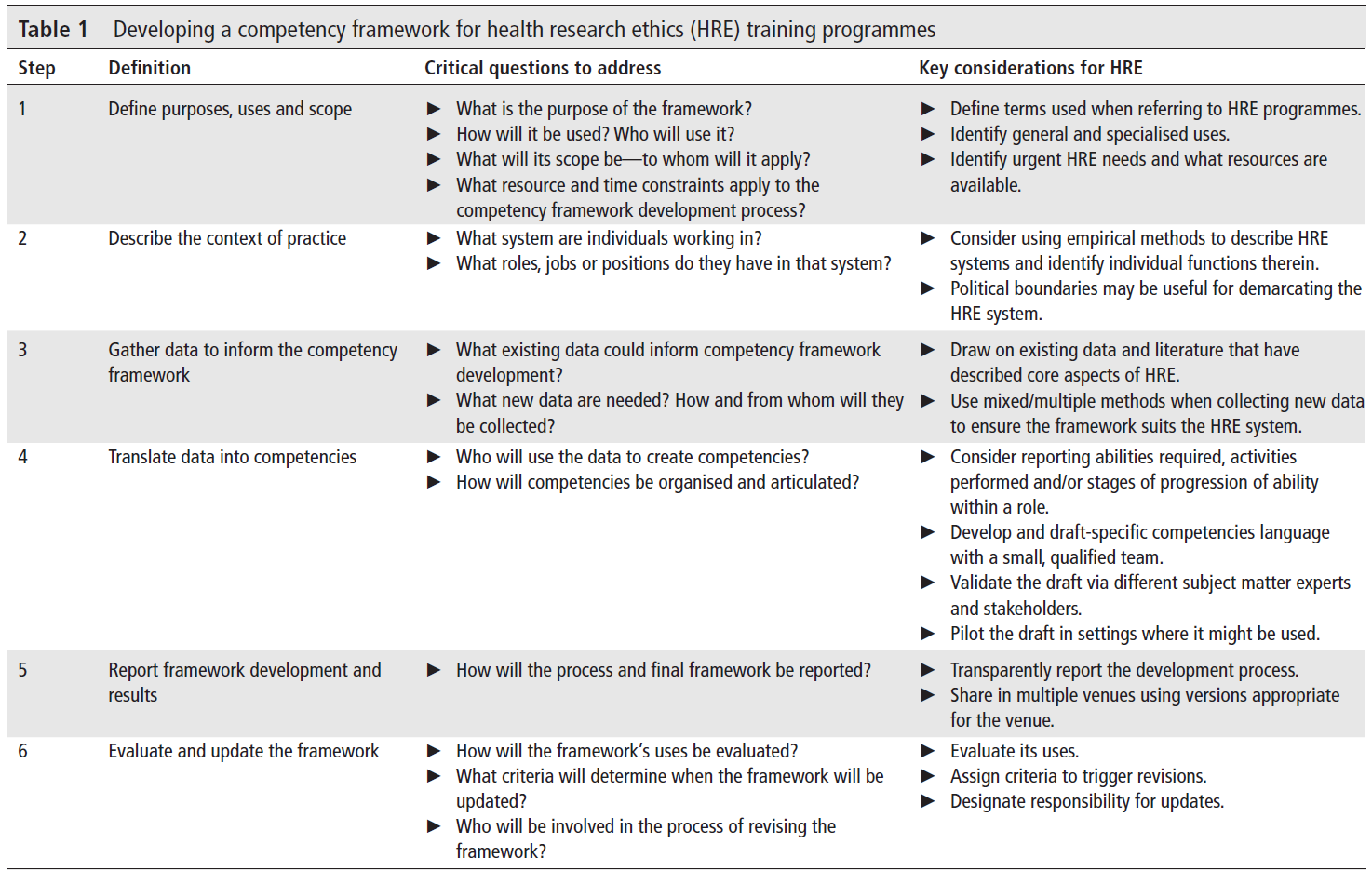 보건 연구 윤리(HRE) 교육 프로그램을 위한 역량 프레임워크 개발의 6단계 요약