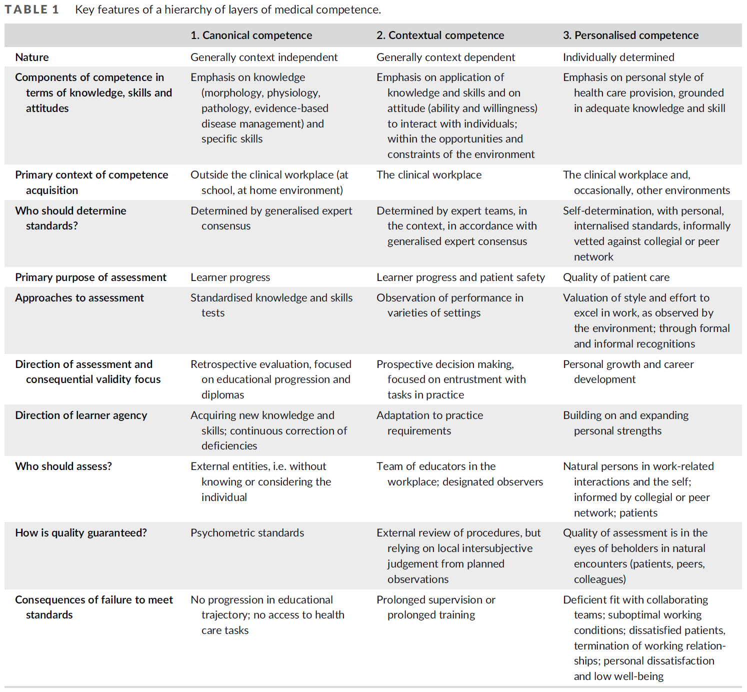 이제부터 우리는 각 층위의 성격, 중요성, 교육 및 평가에 미치는 함의를 하나씩 자세히 다룰 것이다. 특히 제3층위인 ‘개인화된 역량(personalised competence)’은 비교적 새로운 개념이므로 이에 가장 많은 논의를 할 예정이다. Table 1은 이후 설명될 내용을 요약한 것이다. 이 표에서 세 개의 열로 구조화된 표현은 세 층위가 별개로 발달하는 것처럼 보일 수 있지만, 이는 우리의 의도가 아니다. 실제 의료 역량의 발달은 항상 이들 층위 간의 상호작용을 포함하며, 우리는 이 구분이 표준 설정과 평가 전략 설계에 개념적 도움을 준다는 점에서 의미가 있다고 본다.