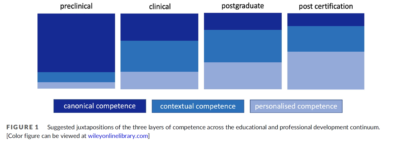 우리는 이 세 가지 층위가 모두 의료 역량에 필수적인 요소이며, 그러나 표준화의 요구에 대해 각기 다르게 반응하므로, 평가와 교육에서도 서로 다른 방식으로 접근되어야 함을 주장할 것이다. 이 층위들은 위계적으로 배열되어 있지만, 완전히 선형적인 순서로 발달하는 것은 아니다. 예컨대 제2층위(상황적 역량)는 제1층위(정전적 역량)를 전제로 하고, 제3층위(개인화된 역량)는 제2층위를 전제로 하지만, 조기부터 발달이 시작될 수 있다. 아래 Figure 1에서도 볼 수 있듯이, 정전적 역량은 임상 교육이 주도하는 시기에도 계속 발달할 수 있고, 개인화된 역량은 전문가로 성장하는 초기 단계에서부터 서서히 나타날 수 있다.